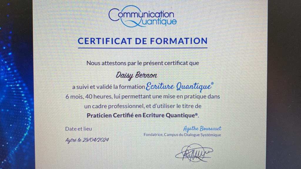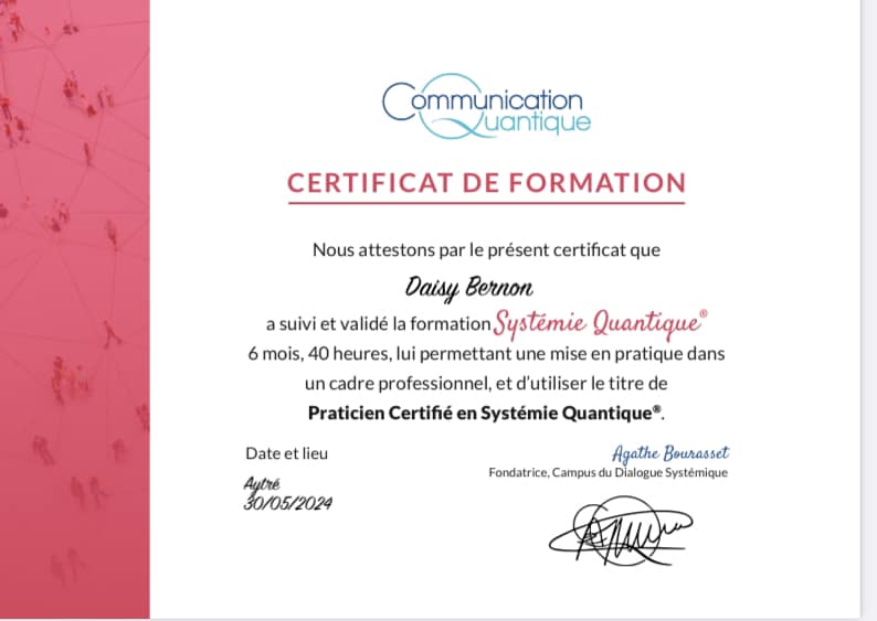 J’accompagne grâce à la systémie quantique, une méthode qui utilise des pierres pour symboliser les différents éléments d’un même système. Je combine cette méthode à la libération émotionnelle qui consiste à être à l’écoute des sensations. Je suis formée en Communication Quantique (https://communication-quantique.com/) depuis 2024.